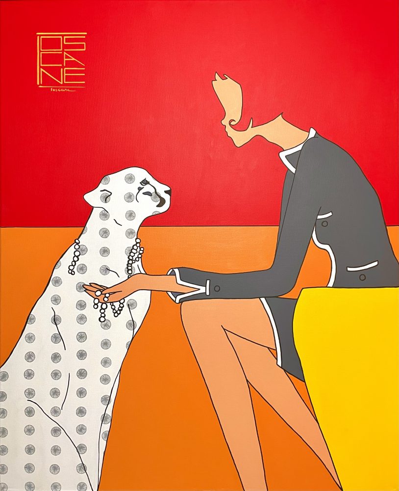 Her minimalist visual language, influenced by Art Deco and shaped by a rigorous symbolism, is structured around the WHITE ANIMAL, a healing figure that echoes TOSCANE’s past struggle with illness. As a symbol of protection and transformation, it bridges French and Japanese imaginaries.